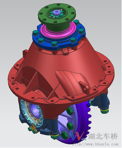新能源客車主減總成為單級(jí)減速結(jié)構(gòu),由主減速器殼、左右差速器殼、軸承座、主從動(dòng)錐齒輪、行星齒輪、半軸齒輪、十字軸、突緣總成、主動(dòng)錐齒輪油封總成、軸承等零部件組成,扭矩大、傳動(dòng)效率高